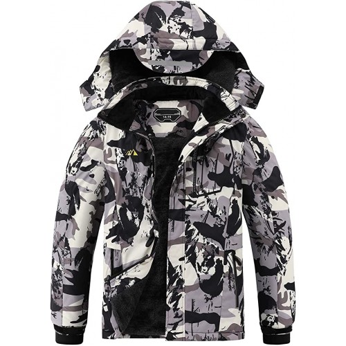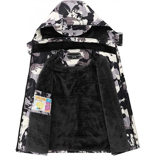 White Camouflage PrintedBoy's Waterproof Ski Jacket Warm Winter Snow Coat Fleece Snowboarding Jackets Thick Hooded Windproof Raincoat
